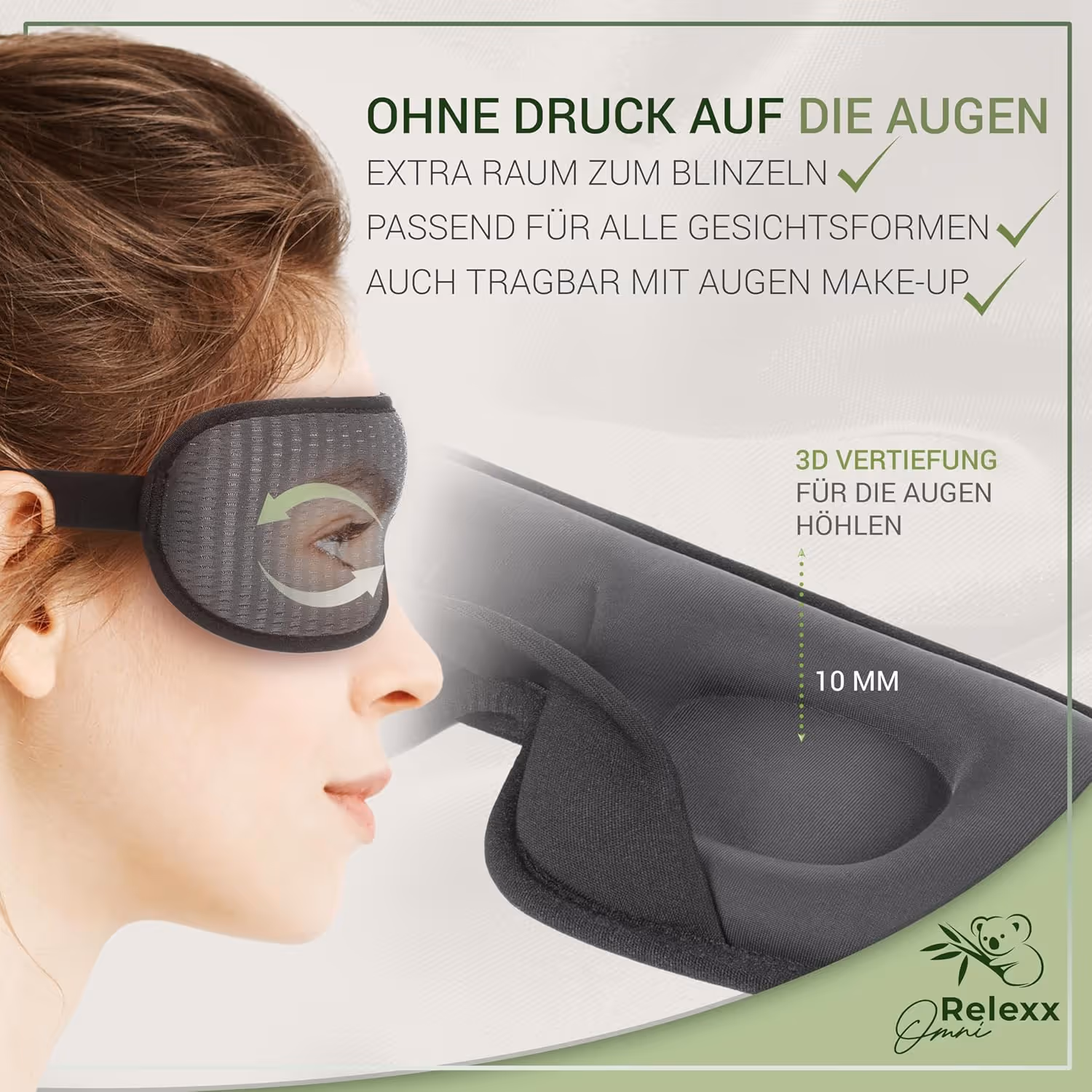 Die OmniRelexx® Schlafmaske wurde entwickelt, um Licht vollständig auszublenden und gleichzeitig maximalen Komfort zu bieten. Durch das atmungsaktive 3D-Design entsteht ein natürlicher Schlafraum für die Augen, ohne Druck und ohne Ablenkung. Für erholsamen Schlaf, zuhause und unterwegs.